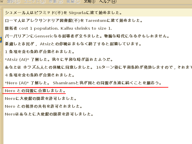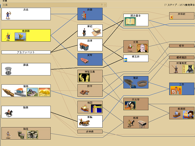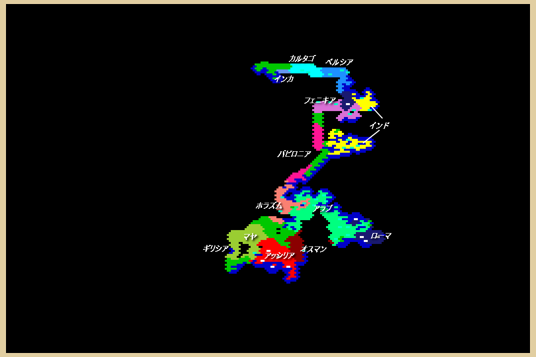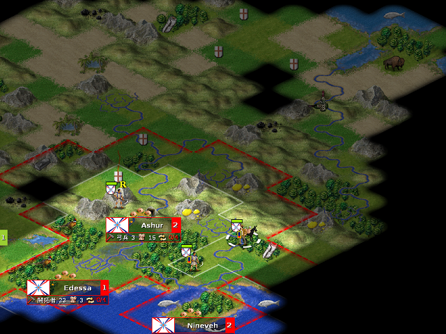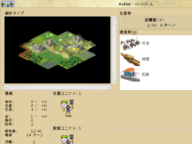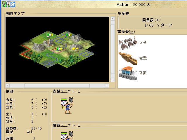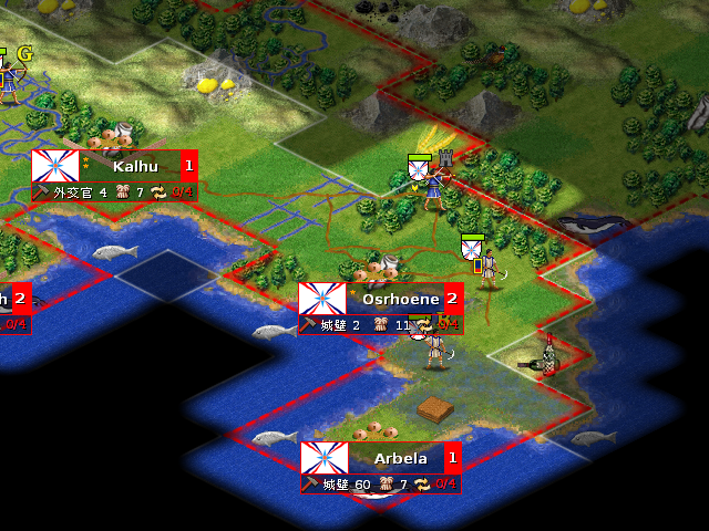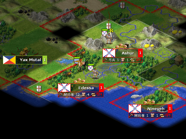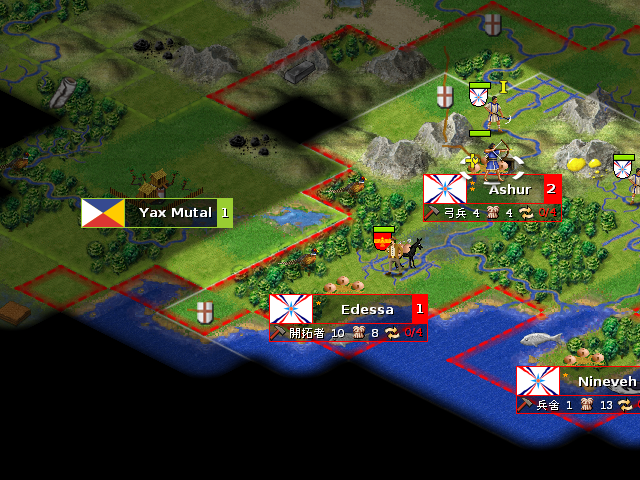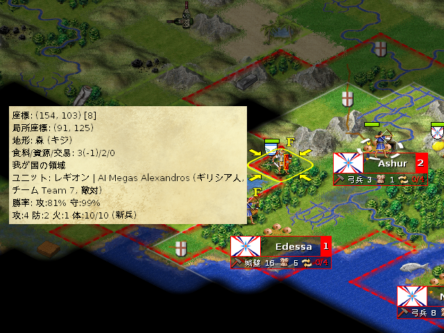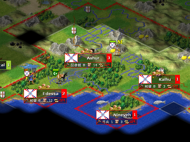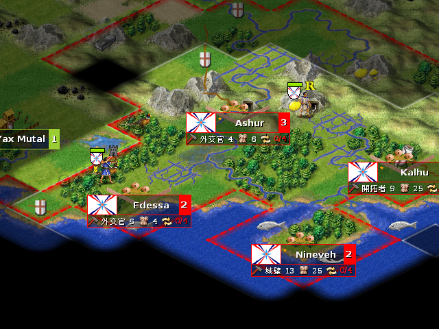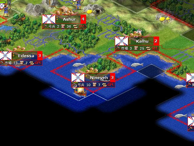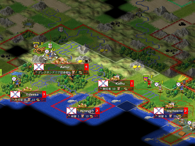 × [PR]上記の広告は3ヶ月以上新規記事投稿のないブログに表示されています。新しい記事を書く事で広告が消えます。 紀元前1400年頃 首都アッシュールで図書館が完成する。 市民が自由に利用できる図書館ができたことで、これ以降研究結果の蓄積が進み、科学技術の研究が加速することになる。 同時に外交の専門家の育成も始まった。 紀元前1050年にはアレクサンドリア図書館の建設も開始された。 外交面では紀元前1350年頃。ローマとの和平条約が締結される。 また紀元前1200年頃にはアラブとの停戦延長が決まり、軍事大国との正面衝突は避けることができた。 そして紀元前975年に、アッシリアとローマの間で軍事同盟が結ばれる。 背景として、アッシリアはマヤやオスマンとの国境争い、そしてその後ろに控える軍事大国アラブへの危機感があった。 一方でローマもアラブやホラズムという軍事大国との戦争が続いており、飛び地であった重要都市、ローマをホラズム人に落され、紀元前1000年には、首都べネヴェンタムがアラブ軍の侵攻を受けて陥落したばかりだった。 こうした大国による恐怖から、両国が同盟を結び、技術や資金提携を行うことで、防衛力を高める目的があった。 しかしこの同盟は、同年に和平条約を結んだホラズムや、暫定的に停戦延長を約束したアラブからの非難を買うことになる。 またアッシリアの態度から、ローマでは同盟そのものに対しての不信感も強まっていった。 975 BC(T61)-475 BC(T81) アッシリアとローマ、スコア的にはあわせてようやくアラブと同じ56… ローマが北部勢力と休戦を結んでくれているのがせめてもの救いです。何とかしてこちらの勢力と接触したいところですが、間にはアラブやホラズム領があります。あれ?無理じゃね? 900 BC(T64) ヒッタイト人の戦士と接触。停戦を結びます。 マヤのチャリオット(戦車)が攻めてきたため、山に篭られる前に首都の弓兵部隊を派遣し、破壊します。弓兵はエリートになりました。よほどのことが無ければ負けないでしょう。 そして、アラブの戦士部隊数個に囲まれていたローマですが、ここにきて弓兵部隊を購入し、一気に蹴散らしているようです。ナイス このターンにエジプト人がアレクサンドリア図書館を建設。案の定取られてしまいました。 まぁマヤ人やアラブ人に取られていたら、ほぼ詰んでいたかもしれません。 ローマが104gold(全財産)で君主制と騎乗を教えてくれました。恐らく割安なので買います。 ついでに目標は火薬にしておきます。 この科学は恐らく中盤で最も重要な技術です。というのも、これで作れるようになるマスケット兵は、攻撃・防御が3・3と、弓兵より1ポイント防御が高いユニットなのですが、体力が2倍の20ポイントとなっており、攻撃と防御の両方で圧倒的な強さを誇ります。 正直、上手く運用されたら弓兵が2・3体束になっても勝てませんし、序盤で唯一の砲兵(防御が低い代わりに攻撃が最強なユニットの種類)である、カタパルトでもかなり苦戦します。 要するに序盤と中盤の境目となるユニットで、これを持っていれば、しばらくは怖いものは無い、そんなユニットです。 余談ですが自分はこいつを見ると、初めてこのゲームをやった時に、労働者をチャリオットや騎兵に殺され、都市の制御や外交の仕方も分からず、四面楚歌で暴動がおきまくる中、マスケットの攻撃でじわじわ領土を削り取られていくそんな記憶が蘇ります。 紀元前850年(T66) アッシリアは革命を起こし無政府状態になります。 そして次のターン、紀元前825年(T67)に君主制国家として生まれ変わりました。 税収も4から11と大幅に増えており、ローマの技術を買って悪化した財政を立て直すことができそうです。 そしてペナルティが解除されたということは、当然生産力も大幅に上昇しております。 第6都市、アルベラを建設。 君主制に変わり多少汚職が減ったので、ニネヴェ半島とともに、このアルベラ半島も、交易都市として開発をしていく予定です。幸い戦場となるであろう地域からは離れているので、国の財政がこの地域にかかっています。 続いて紀元前775(T69)に貨幣を発見。 市場を建設すると、その都市の税収と贅沢が増えます。維持費は城壁と同じく0なので、建てておいて損は無い施設です。 ここで路線変更し、先に地図と交易を研究してみます。 ついでにローマはまた都市を落され、新たな首都となったタレントゥムをアラブの弓兵部隊1部隊、騎馬兵7部隊に包囲されています。 もうダメなんじゃないかなこの国… そして2度目のホラズムへの宣戦要求が来たため、紀元前725(T71)に一旦同盟を解消しました。 どっちにしろ向こうから切られるので、こちらから切った方が多少態度が悪化せずにすむはずです。 700 BC(T72) アラブとの停戦終了と同時に、探検家を殺されます。しかし停戦継続には応じてくれました。悔しいですがこの国を敵に回すと何もできませんので停戦を結びます。 ついでに地図の研究が終わったので