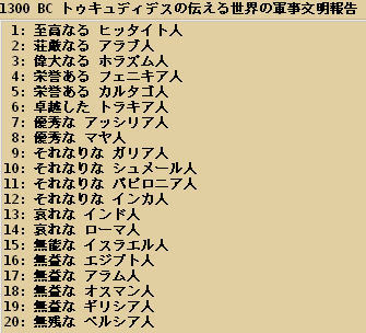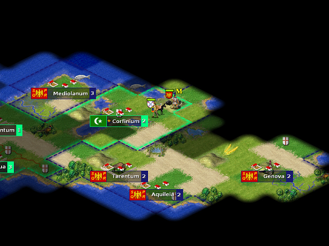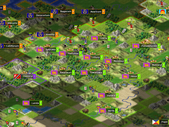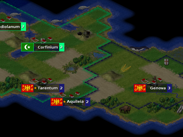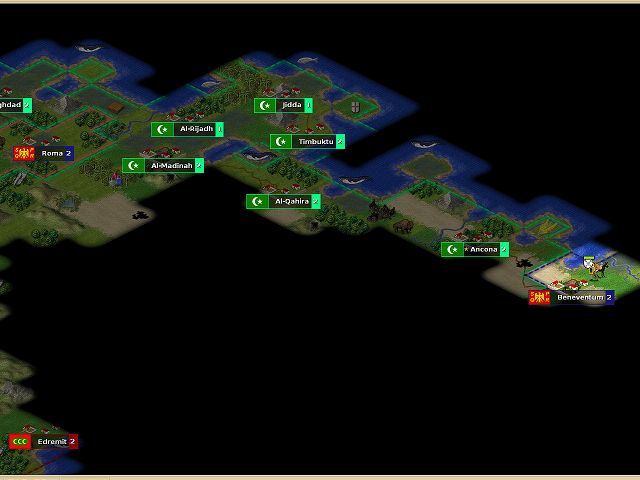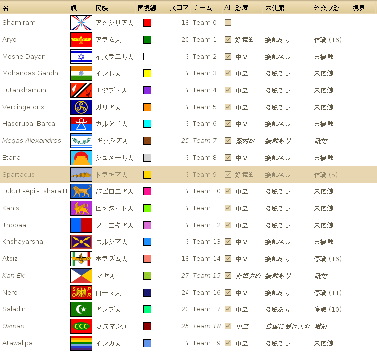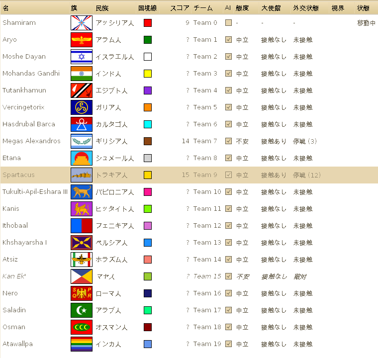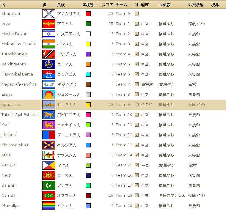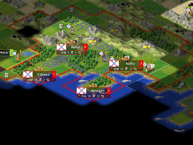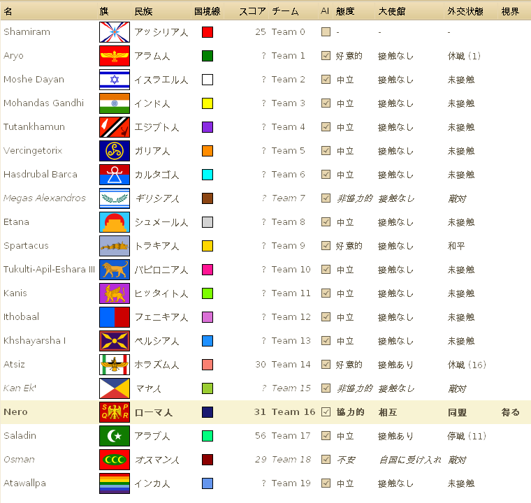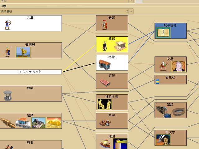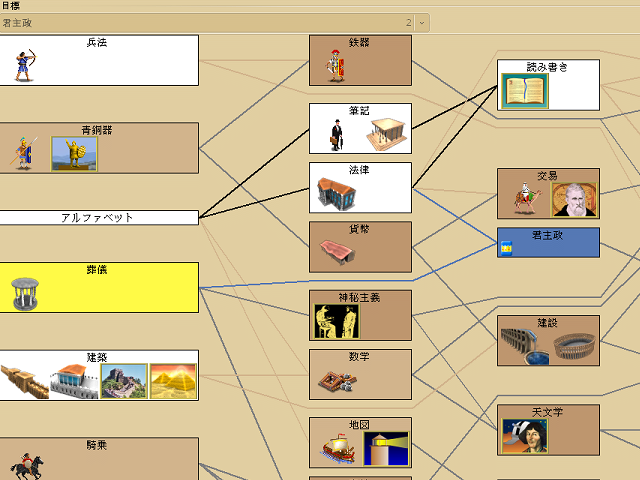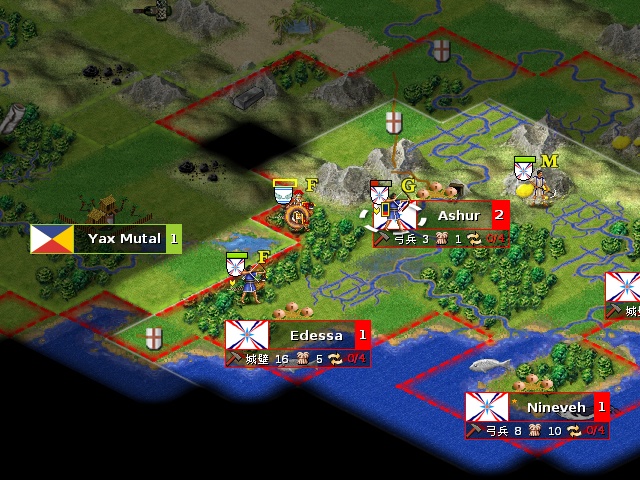 × [PR]上記の広告は3ヶ月以上新規記事投稿のないブログに表示されています。新しい記事を書く事で広告が消えます。 紀元前1400年頃 首都アッシュールで図書館が完成する。 市民が自由に利用できる図書館ができたことで、これ以降研究結果の蓄積が進み、科学技術の研究が加速することになる。 同時に外交の専門家の育成も始まった。 紀元前1050年にはアレクサンドリア図書館の建設も開始された。 外交面では紀元前1350年頃。ローマとの和平条約が締結される。 また紀元前1200年頃にはアラブとの停戦延長が決まり、軍事大国との正面衝突は避けることができた。 そして紀元前975年に、アッシリアとローマの間で軍事同盟が結ばれる。 背景として、アッシリアはマヤやオスマンとの国境争い、そしてその後ろに控える軍事大国アラブへの危機感があった。 一方でローマもアラブやホラズムという軍事大国との戦争が続いており、飛び地であった重要都市、ローマをホラズム人に落され、紀元前1000年には、首都べネヴェンタムがアラブ軍の侵攻を受けて陥落したばかりだった。 こうした大国による恐怖から、両国が同盟を結び、技術や資金提携を行うことで、防衛力を高める目的があった。 しかしこの同盟は、同年に和平条約を結んだホラズムや、暫定的に停戦延長を約束したアラブからの非難を買うことになる。 またアッシリアの態度から、ローマでは同盟そのものに対しての不信感も強まっていった。 975 BC(T61)-475 BC(T81) アッシリアとローマ、スコア的にはあわせてようやくアラブと同じ56… ローマが北部勢力と休戦を結んでくれているのがせめてもの救いです。何とかしてこちらの勢力と接触したいところですが、間にはアラブやホラズム領があります。あれ?無理じゃね? 900 BC(T64) ヒッタイト人の戦士と接触。停戦を結びます。 マヤのチャリオット(戦車)が攻めてきたため、山に篭られる前に首都の弓兵部隊を派遣し、破壊します。弓兵はエリートになりました。よほどのことが無ければ負けないでしょう。 そして、アラブの戦士部隊数個に囲まれていたローマですが、ここにきて弓兵部隊を購入し、一気に蹴散らしているようです。ナイス このターンにエジプト人がアレクサンドリア図書館を建設。案の定取られてしまいました。 まぁマヤ人やアラブ人に取られていたら、ほぼ詰んでいたかもしれません。 ローマが104gold(全財産)で君主制と騎乗を教えてくれました。恐らく割安なので買います。 ついでに目標は火薬にしておきます。 この科学は恐らく中盤で最も重要な技術です。というのも、これで作れるようになるマスケット兵は、攻撃・防御が3・3と、弓兵より1ポイント防御が高いユニットなのですが、体力が2倍の20ポイントとなっており、攻撃と防御の両方で圧倒的な強さを誇ります。 正直、上手く運用されたら弓兵が2・3体束になっても勝てませんし、序盤で唯一の砲兵(防御が低い代わりに攻撃が最強なユニットの種類)である、カタパルトでもかなり苦戦します。 要するに序盤と中盤の境目となるユニットで、これを持っていれば、しばらくは怖いものは無い、そんなユニットです。 余談ですが自分はこいつを見ると、初めてこのゲームをやった時に、労働者をチャリオットや騎兵に殺され、都市の制御や外交の仕方も分からず、四面楚歌で暴動がおきまくる中、マスケットの攻撃でじわじわ領土を削り取られていくそんな記憶が蘇ります。 紀元前850年(T66) アッシリアは革命を起こし無政府状態になります。 そして次のターン、紀元前825年(T67)に君主制国家として生まれ変わりました。 税収も4から11と大幅に増えており、ローマの技術を買って悪化した財政を立て直すことができそうです。 そしてペナルティが解除されたということは、当然生産力も大幅に上昇しております。 第6都市、アルベラを建設。 君主制に変わり多少汚職が減ったので、ニネヴェ半島とともに、このアルベラ半島も、交易都市として開発をしていく予定です。幸い戦場となるであろう地域からは離れているので、国の財政がこの地域にかかっています。 続いて紀元前775(T69)に貨幣を発見。 市場を建設すると、その都市の税収と贅沢が増えます。維持費は城壁と同じく0なので、建てておいて損は無い施設です。 ここで路線変更し、先に地図と交易を研究してみます。 ついでにローマはまた都市を落され、新たな首都となったタレントゥムをアラブの弓兵部隊1部隊、騎馬兵7部隊に包囲されています。 もうダメなんじゃないかなこの国… そして2度目のホラズムへの宣戦要求が来たため、紀元前725(T71)に一旦同盟を解消しました。 どっちにしろ向こうから切られるので、こちらから切った方が多少態度が悪化せずにすむはずです。 700 BC(T72) アラブとの停戦終了と同時に、探検家を殺されます。しかし停戦継続には応じてくれました。悔しいですがこの国を敵に回すと何もできませんので停戦を結びます。 ついでに地図の研究が終わったので