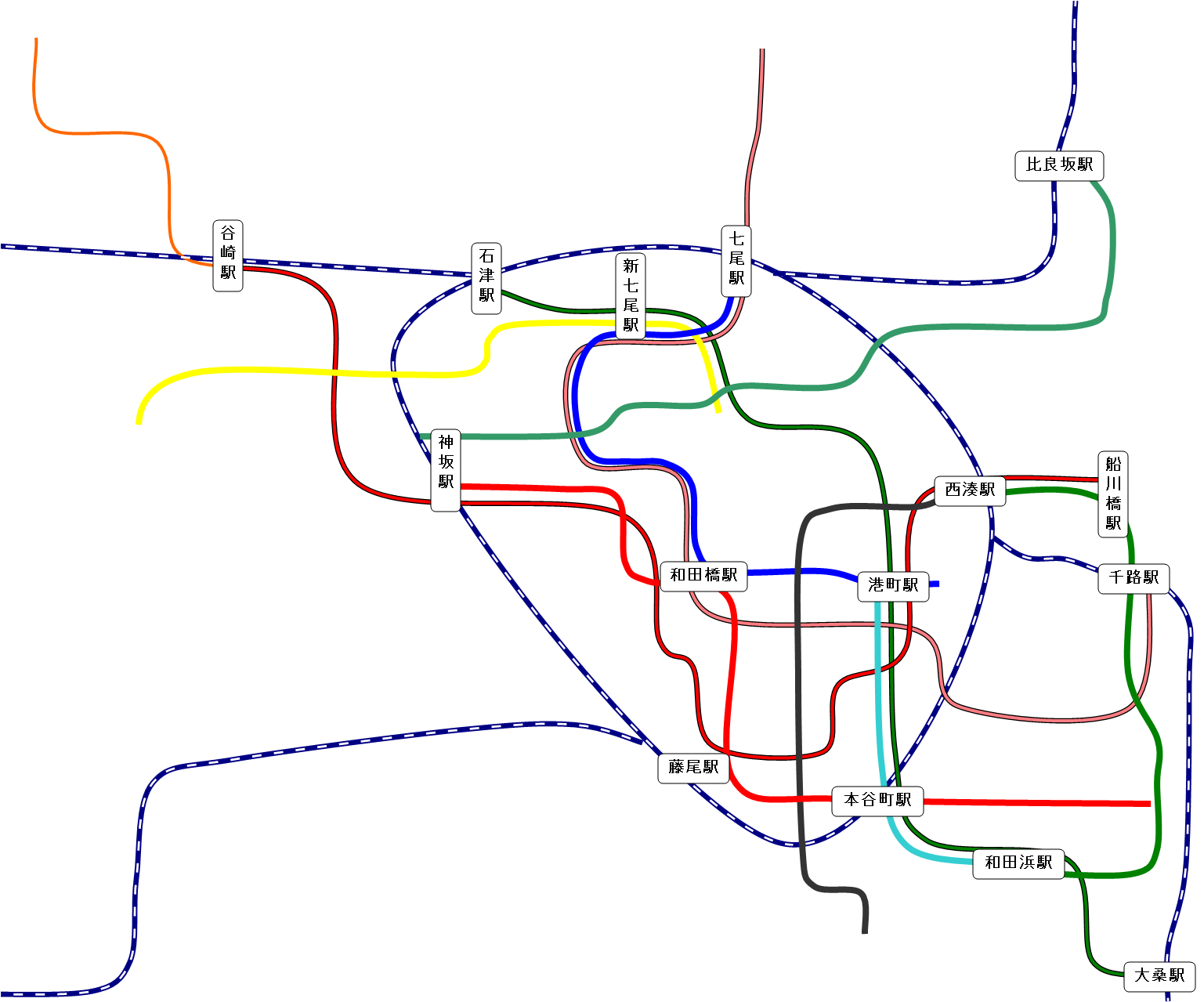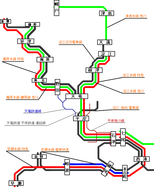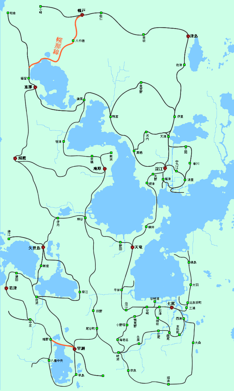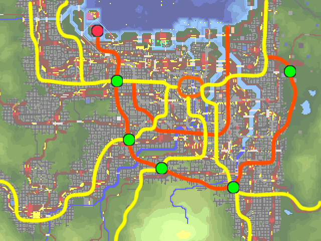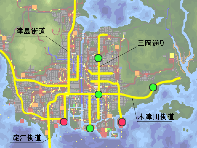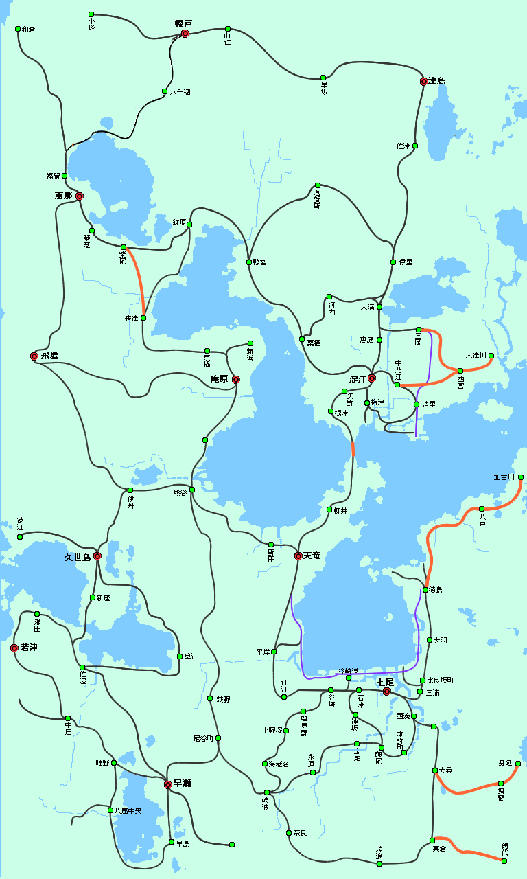 郵便事業の強化をします。 さらに前回の優等列車設定と共に発展中の早瀬方面と恵那方面、さらに何気に広大な土地 がある 久世島・若津周辺の湖畔地域にも郵便網と同時に、道路の整備をします。 更に久世島方面と北部の幌戸方面には空港を設置して、首都圏と結ぶことで、高速輸送を 可能にします。 まずは首都圏の道路改良です。 首都圏は環状と放射線を組み合わせて多核都市構造っぽくにする予定です。 3環状のうち外側2環状を作り、放射線も整備。 環状道路は完成ではありませんが、沿岸部は難易度が高いのでしばらくこのままです。 線=幹線道路≒郵便路線 緑の○が拠点となる郵便局。紫の○が全国規模の郵便ターミナルです。 オレンジが環状道路で黄色が主要国道を表しています。 50年代に入り新型郵便トラックが出たこともあり、長距離陸上輸送を見据えた 幹線道路沿いに拠点を建設。そしてそれらを結ぶように張り巡らされた路線網が 新たに設定された地下鉄郵便列車の間を縫うように走っています。 各地方や都心部から運ばれた郵便物が、一番外側の第三環状沿線の郵便局に集められ、 平岸郵便ターミナルへと運ばれ、船で各地に輸送されます。 今はまだ海上輸送がメインですが、将来高速道路で陸上輸送が可能になったら これらの拠点郵便局から、北部へも直接トラック輸送ができるようになるはずです。 第一環状 七尾市の中心部。尋常じゃない本数の市電を走らせております。 複雑な乗り入れをしようとしたら、案の定パンクしたので運行形態自体はシンプル。 続いて淀江方面です。 碁盤目都市に変えてみようかと思ったものの酷い有様。 まぁ中心部は曲線道路無しということで 淀江東港が新設されたので、本港とあわせて郵便ターミナルが2箇所あります。 環状線と木津川本線やらを高架化。下には東西に木津川街道と南北に三岡通りが通る。 続いては庵原です。 郊外に向かうにつれて設備が貧弱化しますが、中継郵便局はなしで 現状はほぼ直接港に運んでいます。 環状都市にしようかと思ったものの、環状線の形が余りに酷いことになったので 線形構造に急遽変更しました。この道路を基準に、格子状の都市づくりをしていきます。 庵原街道以外は環状の名残です。 続いて恵那市。 庵原は失敗し首都圏も形としては微妙だった為、遥か北西の都市でやたら綺麗な環状道路 を作ってみたり。 近くにあるのは海でなく湖なため、鎌原へ運んだ後に船に乗せます。 早瀬市 この地域の郵便ターミナルとなっており、集めた郵便物を陸運で首都まで運びます。 画像はバス路線に貨物トラックに郵便トラックが集中する中央通り。 景観なんて無かった。 久世島市。 南北に伸びるメインストリートと西側に伸びる徳江街道。そして空港へ向かう道路があり ます。 また南の新座方面に向かう為、空港道路と久世島街道を結ぶ道路を建設し、交点に郵便局 を設置しています。 北の果ての幌戸市 海が遠い為、ひたすら津島街道を通り淀江まで郵便を運んでいましたが、 空港設置により、久世島や七尾方面へ直接運ぶことが可能に。 道路面では空港道路と同時に、津島街道も狭い旧道を廃止し新道に切り替えます。 七尾空港 久世島方面と幌戸方面の2路線が集まり、更に海路の本線航路と接続しています。 南隣に熊川運輸の郵便ターミナルがあります。 ざっと主要道路の整備が終わったので今後はこれを軸に開発を進めていくことになります 。 次は放置状態の私鉄やらその他市内交通を何とかしつつ、もう1952年なのでそろそろ 電車特急が出始める時代っぽいので、もしかしたら同時にやるかもしれません。 それでは PR メモに都心部の路線図を作れと書いてあったので、数ヶ月前の自分に素直に従って、 路線図を作ってみました。 今まで使っていたペイント系ソフトでは、破線の表現ができないので 今回初めてエクセルを使って製図してみました。 破線は国鉄。黒淵がある線は地下鉄。それ以外のごく普通の線は市電です。 色々見づらいけど次回以降直しますorz ■~~追記~~ 地下鉄には郵便用の電車を走らせています。 中心部の3路線が集中している港町駅付近に連絡線がいくつかあり、 上手く3路線の郵便物を集めて新設された、平岸郵便ターミナルに輸送しています。 左上の谷崎駅から先に伸びているオレンジの線が、ターミナルのある港への地下貨物線です 。 ■~~追記部分終わり~~ 郵便網を何とかしようと思っていましたが、長くなりそうなので先に長距離列車と 拡張した地域への路線敷設を先にやります。 まずは新線から。 オレンジ色が新線。ある程度新しい土地をカバーできているはず・・ 紫は貨物線です。首都圏側は前回の時点でもう建設してあったりしましたが、 まだまともに使っていなかったので、ついでに書いておきます 淀江側は、旅客が廃止になって貨物だけ残った路線です。 思ったよりファイルサイズが小さかったので、国鉄の新線は基本これで行きます。 南部の二路線はご