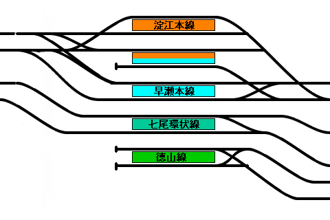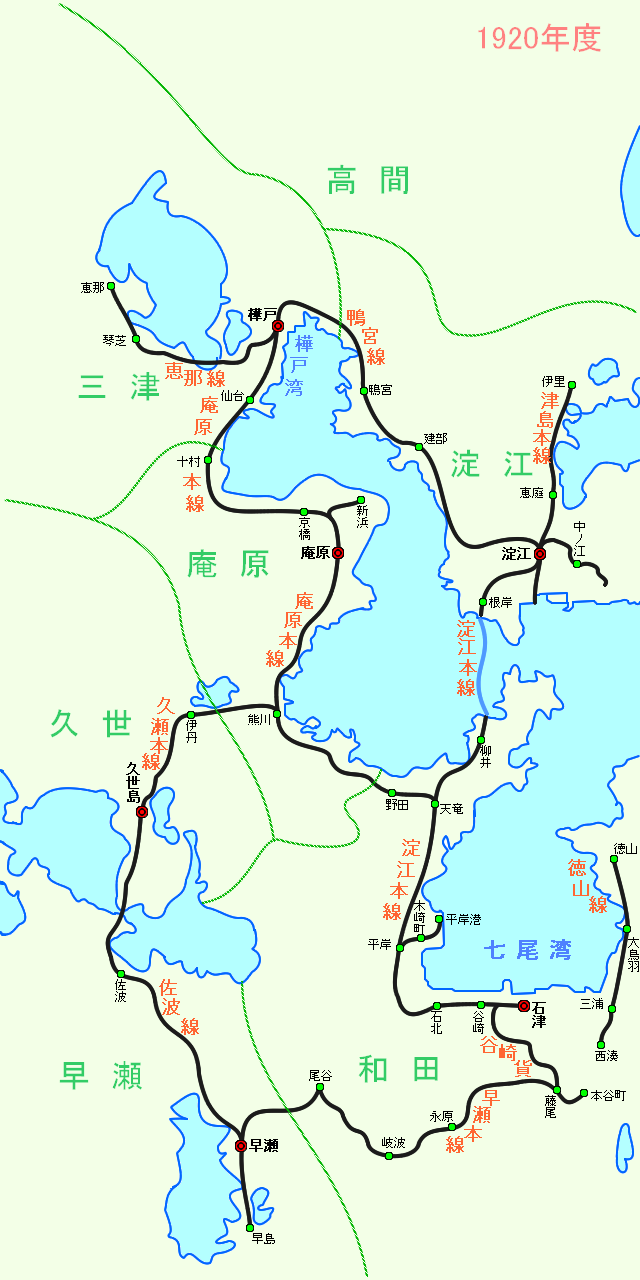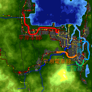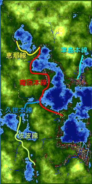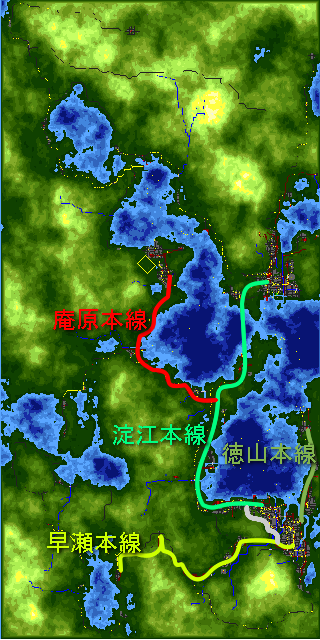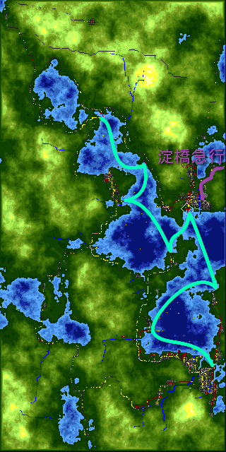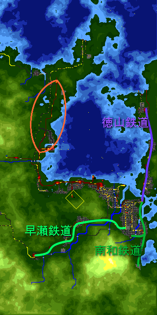 前回の開発で幹線を建設し終えたので 今回はそれに次ぐ準幹線レベルの路線の建設に入ります。 現在大都市としている都市は七尾市(首都圏)以外では淀江市、庵原市の二つだけで、 ・首都圏とそれら大都市を繋ぐ路線を幹線。 ・首都圏と中規模都市を結ぶ路線、大都市同士を結ぶ路線を準幹線、 ・それ以外を地方線。 ・準幹線以上の路線には「本線」とつける と、自分の中で大雑把に分けています。(輸送量は面倒なので考えていません) そして今回建設した国鉄路線がこちらです。 庵原本線の樺戸駅までの延伸。 久世本線、佐波線、恵那線、鴨宮線の建設。 恵庭行鉄道線を津島本線に改称+伊里まで部分開業。 淀江外環線の建設。 早瀬電車線開業。 の五点です。 樺戸駅。 1~2番線 鴨宮線 上り 3~5番線 庵原本線 上り 6~7番線 恵那線 下り 庵原本線の終点の樺戸駅です。 とにかくスペースがあるので貨物輸送の拠点にしやすい感じです。 また鉄道時代以前からの港があるのでその辺も貨物的には有利。 早瀬駅。 1番線 早瀬本線 下り 2~3番線 早瀬本線 上り 4番線 佐波線 上り 久世本線、佐波線、鴨宮線はルートを見ると分かると思いますが 今のところ大幹線を通さずに地方の旅客を地方へ運ぶためだけの路線です。 淀江本線は複線化や新型機関車の投入など、庵原本線も増発と複線化の計画 などで対応していますが、全く追いついていないので結構必死ですw 一方、恵那線と津島本線は今後の延伸のための暫定開業という感じです(SS省略) 中ノ江駅。 国鉄 1~2番線 淀江外環線 上り 3番線 淀江外環線 下り 淀橋急行 1~2番線 三岡線 上り 淀江市街地の外縁を通すようにして建設された淀江外環線。 淀江港・淀江駅・淀橋急行のターミナルを結ぶ目的があります。 主要ターミナルで他社間平面交差とか無茶なことやってます。 そのうち高架化予定。 藤尾駅。 1番線 七尾外環線 上り 2番線 七尾外環線 下り 3~4番線 早瀬本線 上り 5番線 早瀬本線 下り 6番線 早瀬電車線 上り 7番線 早瀬電車線 下り 早瀬本線の起点の本谷町駅から藤尾駅を通り、広尾駅まで 電車線が開通し、初の電車運転が開始されました。 その影響で長距離列車の拠点が本谷町から、ここ藤尾駅に移りました。 単線一両で数編成走らせている現在は、維持費の影響で恐らく赤字ですが 運行利益自体はある程度出ています。 これで今回の国鉄の事業は終わりです。 続いて他社に入ります。 今回は基本的に首都圏です。 七尾市営馬車鉄道千手線の開業。 香澄川東岸の開発と七尾市交通局の事業拡大が目的です。 早瀬電車線に対抗して南和鉄道が電車線を開業。 旧市街地線を改良して、ここ和田浜駅を起点に香澄線として運行しています。 こちらは早瀬電車線と違い、二両の電車も少し走らせています。 ついでに全体の運行形態も見直し、何とか黒字に持っていくことに成功。 石津駅。 更に電車の有用性が認められて、今度は大規模な電車線が開業。 平岸電気軌道が、新設した国鉄平岸駅から石津駅まで全線電化の単線路線で開業。 当初は一両でしたがすぐに輸送力が追いつかなくなり、 二両編成が全体の半分くらいを占めるようになりました。 全線電化で全てを電車運行に頼っているので、大赤字ですが その分周辺の開発に成功すれば一気に利益を伸ばせそうな感じです。 工業地帯の開発計画があるのでそれで伸びる可能性が高いです。 プラス、飛脚組合の熊川組が、熊川運輸と改称して 三都市間の輸送を重点的に見直し、一気に売り上げを伸ばします。 それに協力して淀江市で一編成だけ国鉄郵便列車が運行開始しましたが 国鉄の郵便事業はしばらく本格化しそうにありません。 そんな感じで今回の開発は終わりです。 今回登場した電車は、高い輸送効率で都市部での輸送に大きな力を発揮しています。 今後は都市部の電車と、長距離列車の強化、貨物輸送網の拡大を行っていきます。 おまけに 週末を生贄に路線図を召喚したりしていました。 無意味に地方分けとかしています。 (赤丸の駅は馬車時代の各地拠点=各地方の中心駅) 運行トラブルが起こった際や、旅客流動の変化で利益が急減したときなどに すばやい対応ができない場合が多いため、 事業の規模を広げることで経営を安定させるという手段を取るわけですが、 特に大きな事業を起こすことが多い国鉄は、序盤でいかに路線規模を拡大できるかが鍵になります。 というわけで、今回はもう手遅れレベルの赤字が出ている国鉄の路線網拡大です。 ・具体的には建設途中だった2路線の建設。 ・既存の私鉄線2路線の買収 ・内1路線の延伸 の三つを行いました。 建設後のマップです。 淀江本線が、途中海路を挟みますが一応全線開通です。 庵原本線は天竜駅から分岐して全線開通。 そして前回建設した早瀬鉄道と徳山鉄道を国有化しました。 完成していなかった早瀬線を早瀬駅まで延伸して完成です。 柳井港。 ここから淀江南線と北線を船で連絡します。 柳井汽船の本拠地。 続いて庵原駅。 順調に